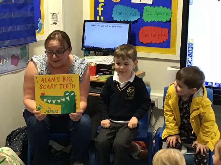 Edward’s Mum came to read for Reception Ash. She read Alan’s Big Scary Teeth by Jarvis.