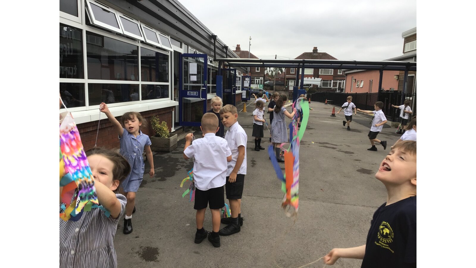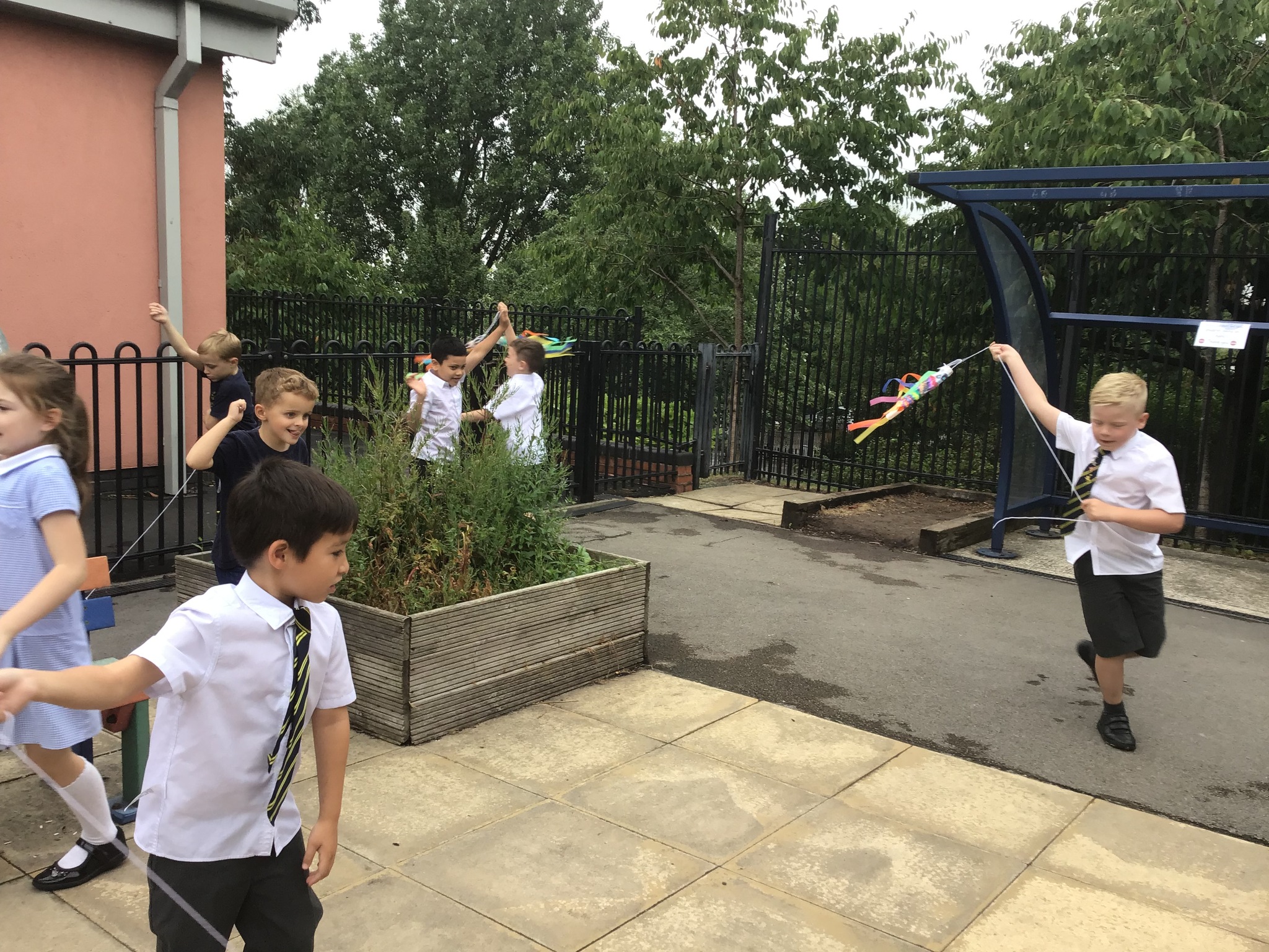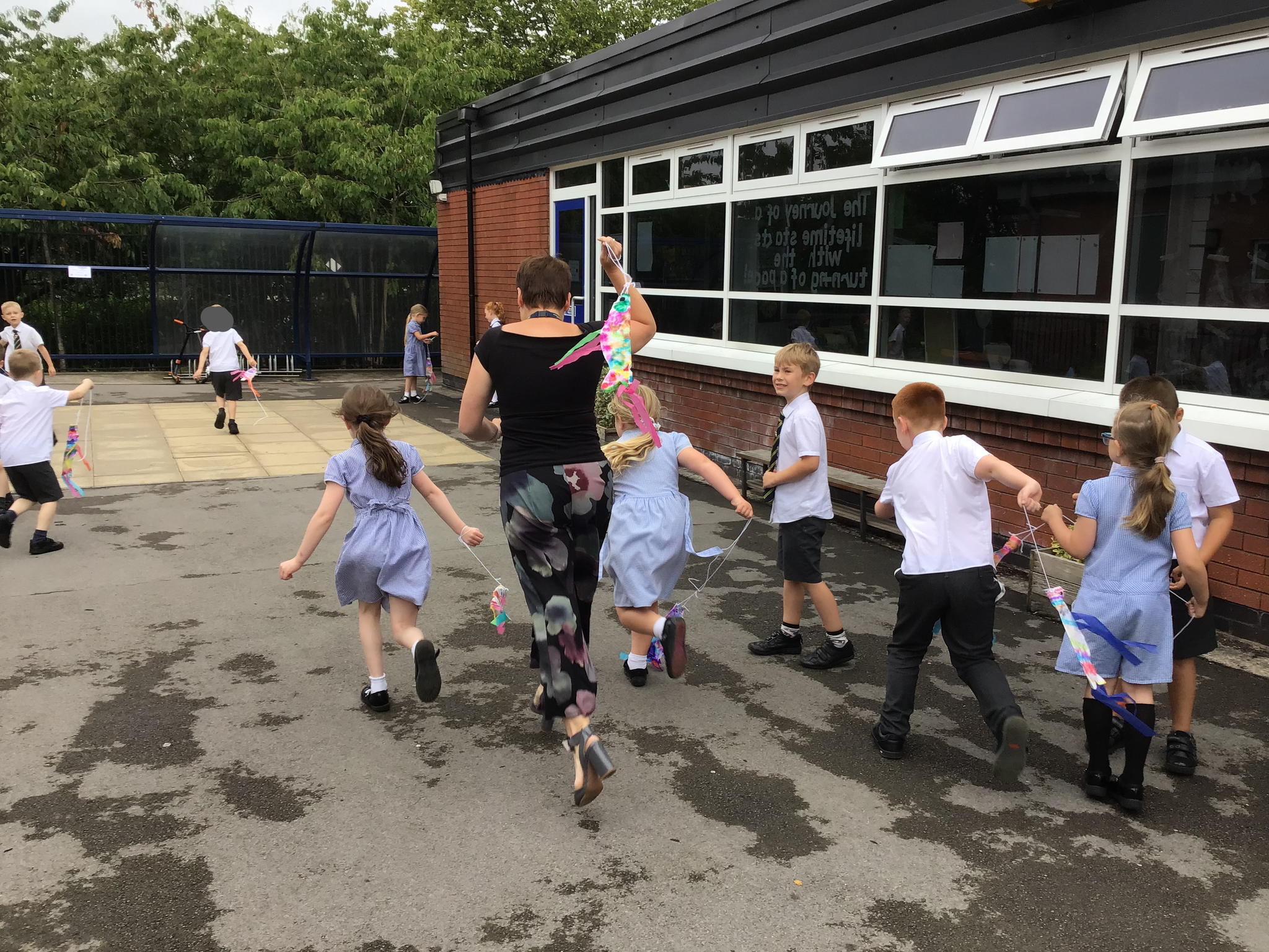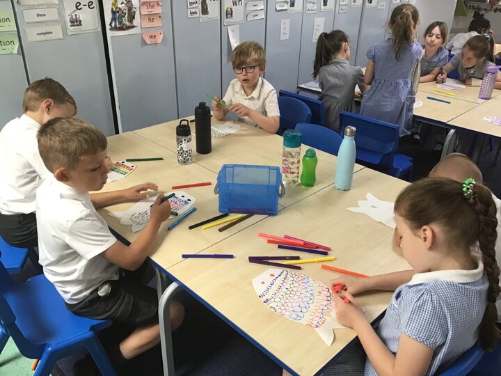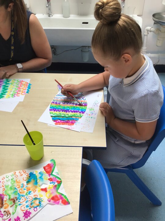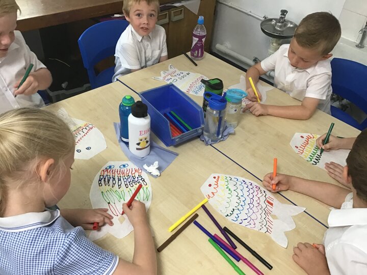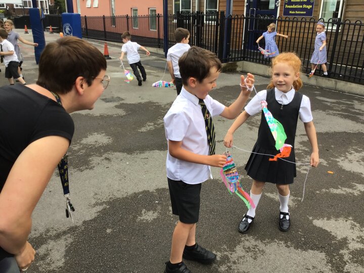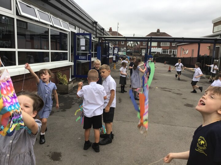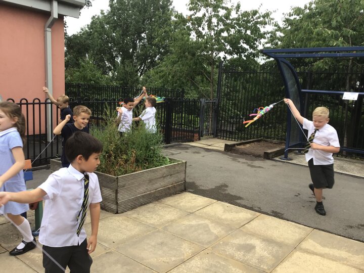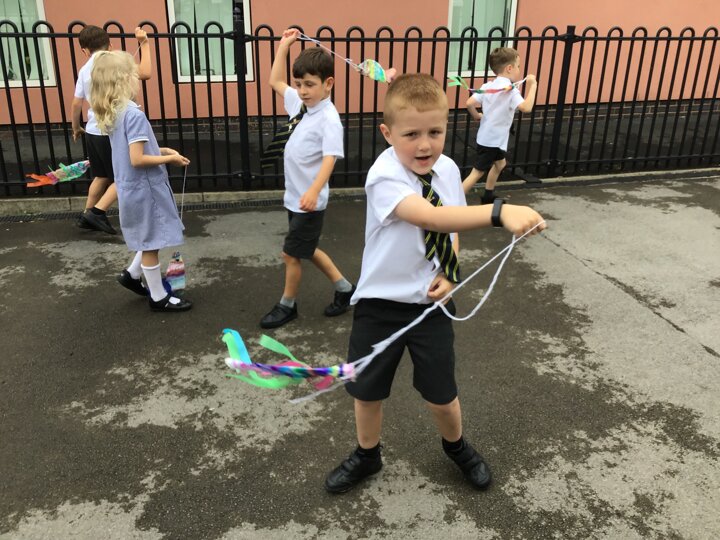 For our Art lesson we made Koinobori kites. We used felt tip pens to draw patterns onto special diffusing paper, we then used water and a paint brush to gently merge the colours together to make the wonderful colours and patterns that you can see. The children then had a little adult help to put the kites together and stick tissue paper on to them. We then went out to fly our kites. It was so much fun!