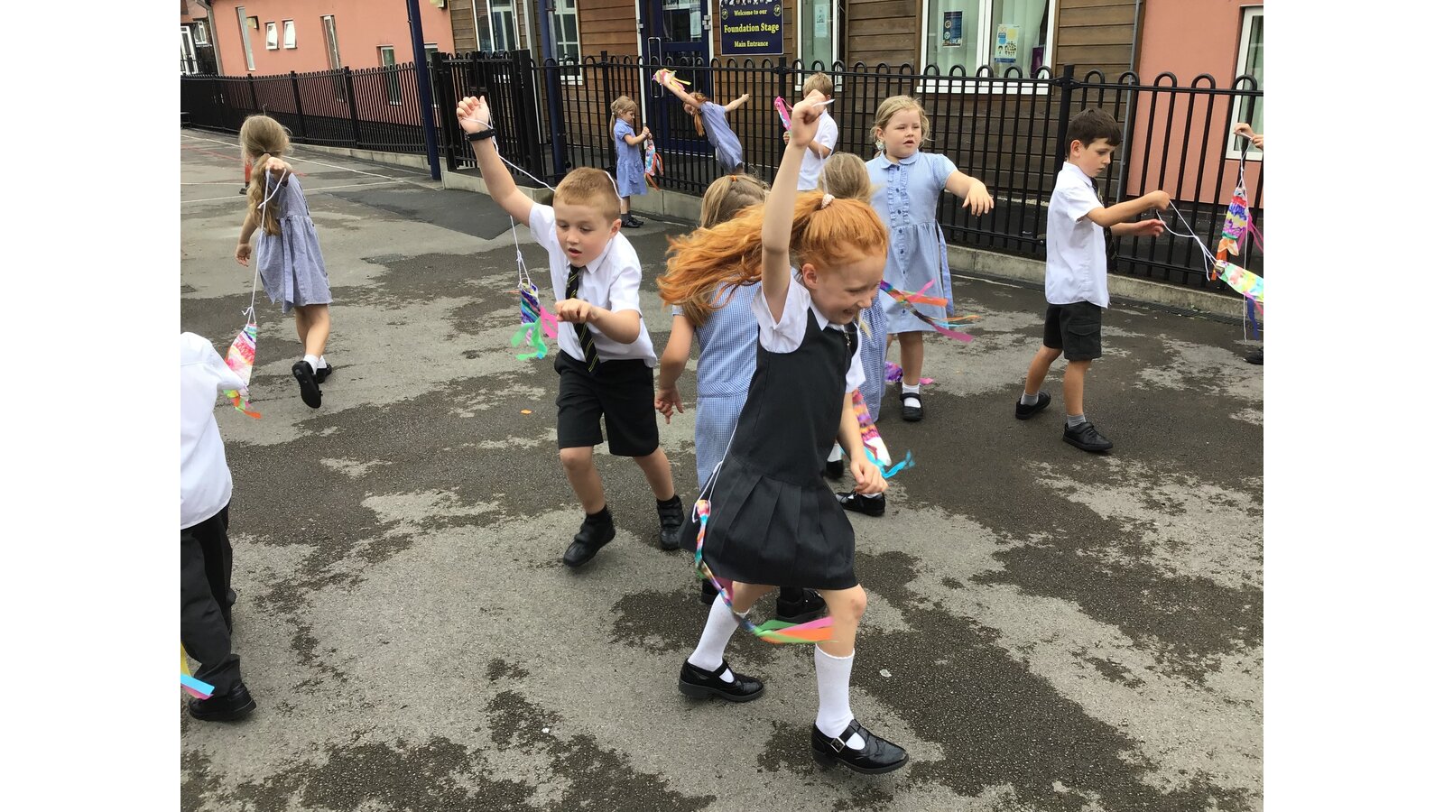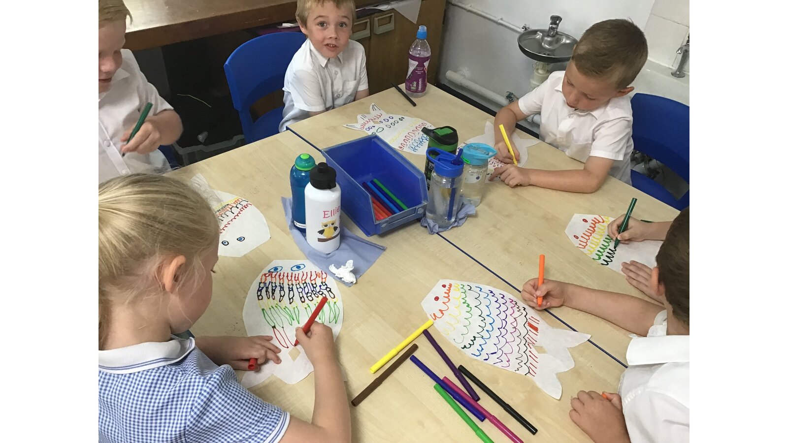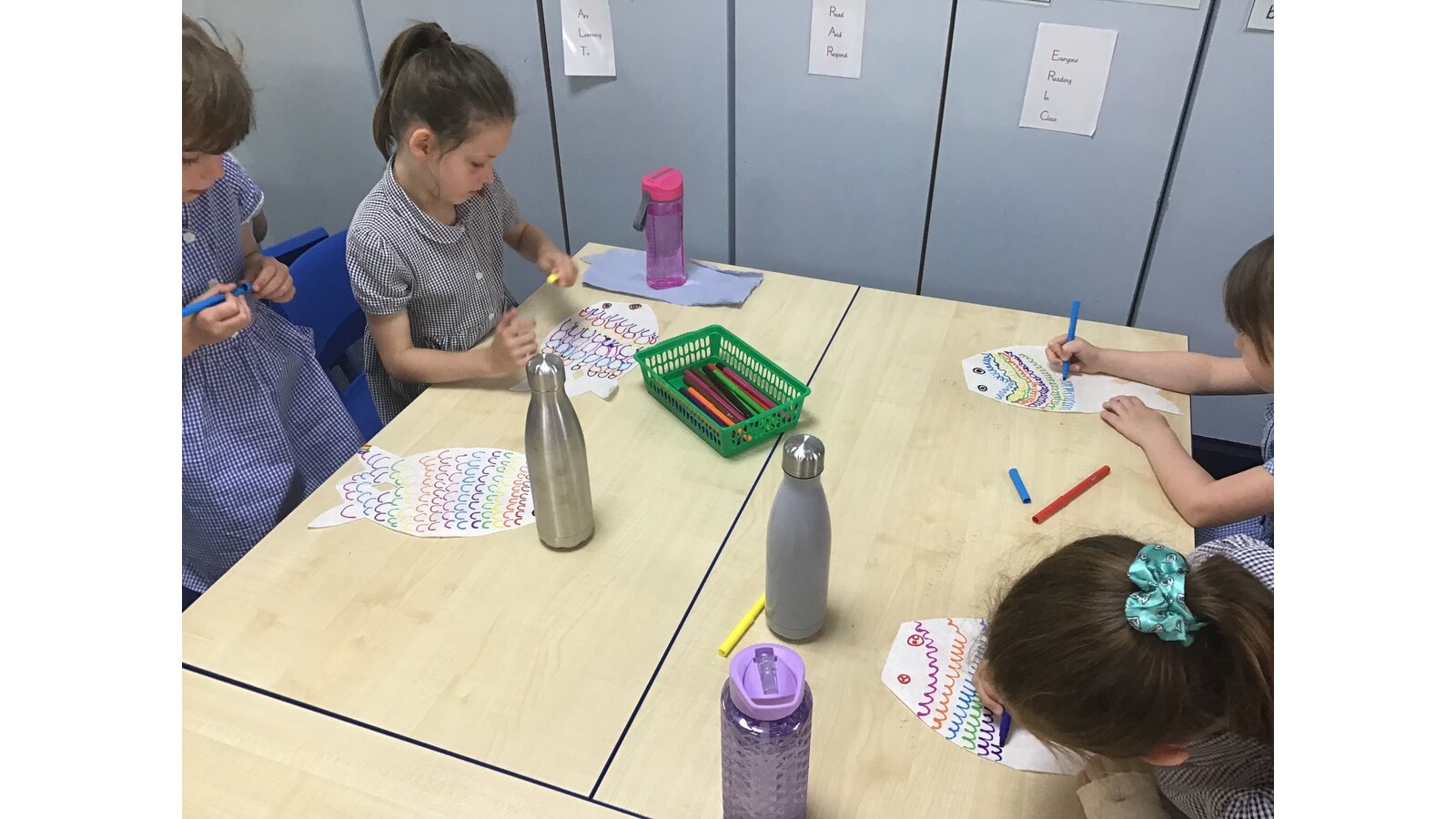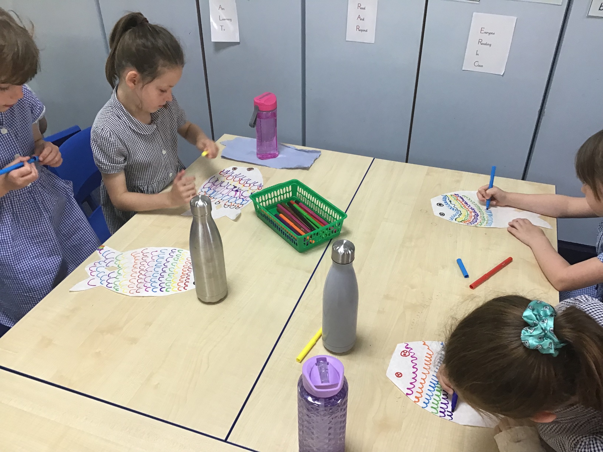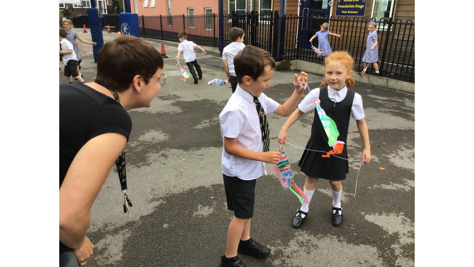 For our Art lesson we made Koinobori kites. We used felt tip pens to draw patterns onto special diffusing paper, we then used water and a paint brush to gently merge the colours together to make the wonderful colours and patterns that you can see. The children then had a little adult help to put the kites together and stick tissue paper on to them. We then went out to fly our kites. It was so much fun!