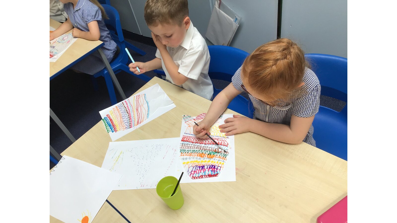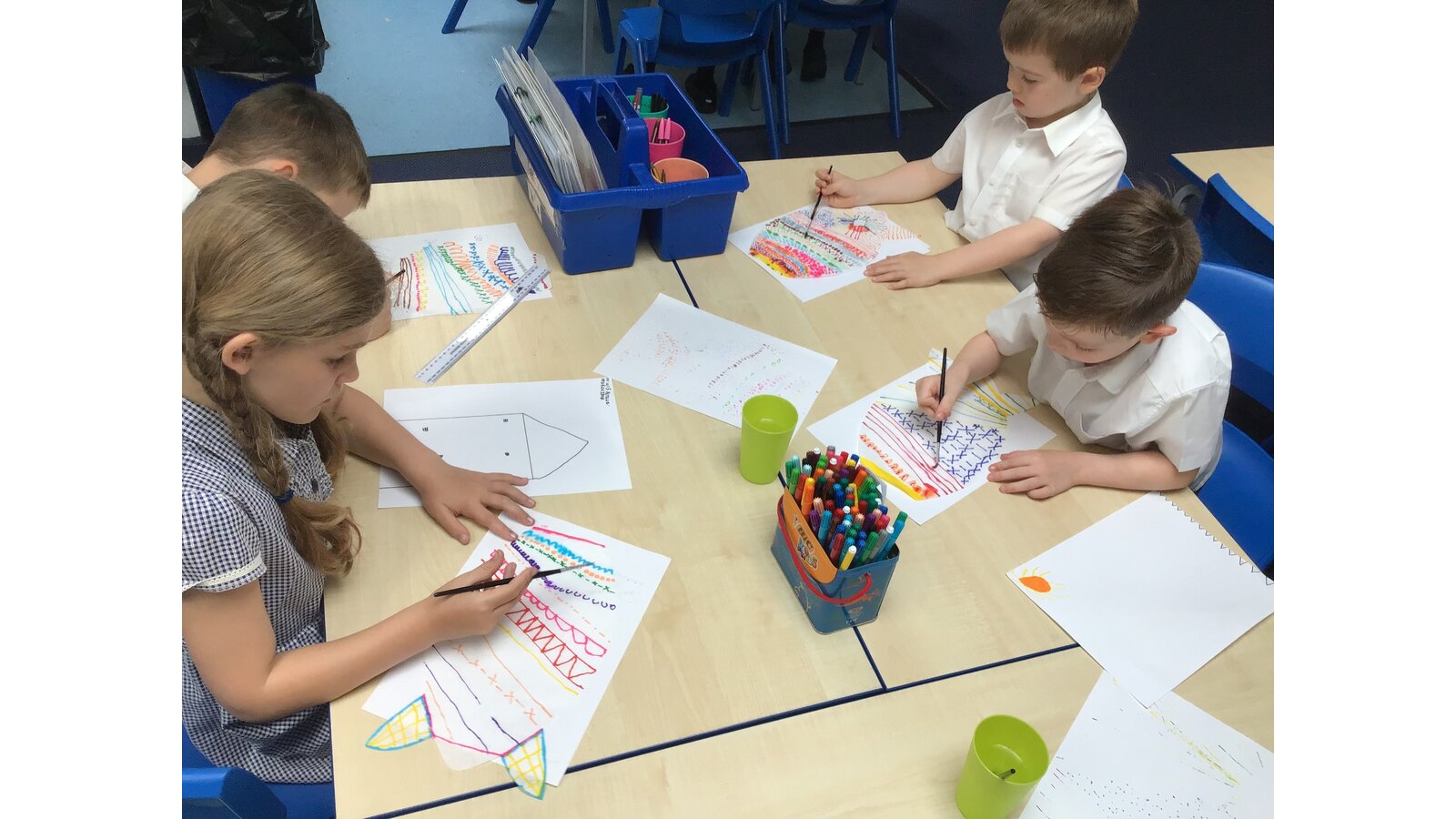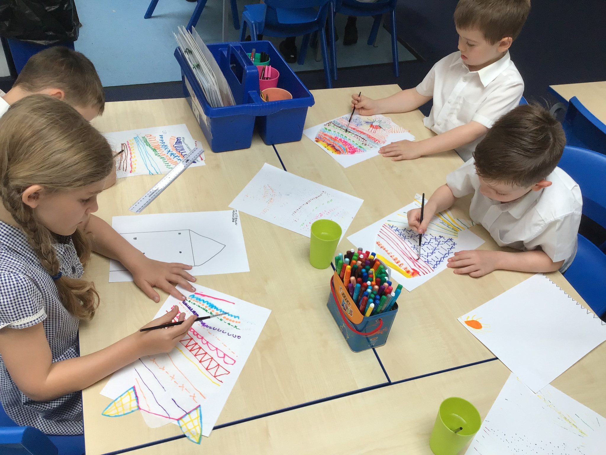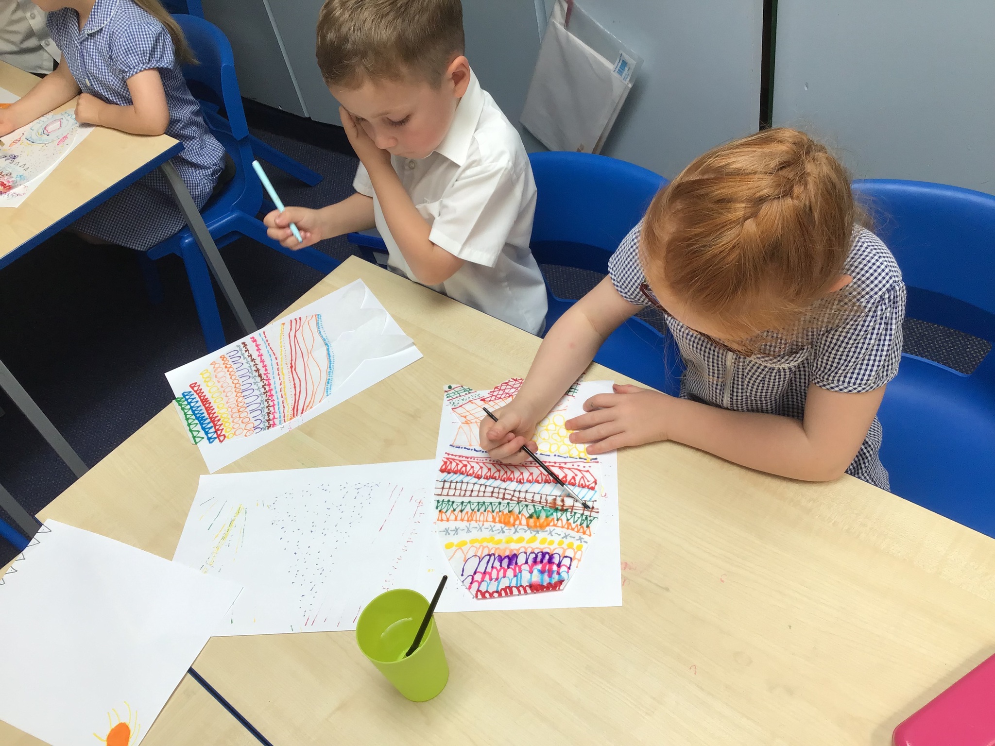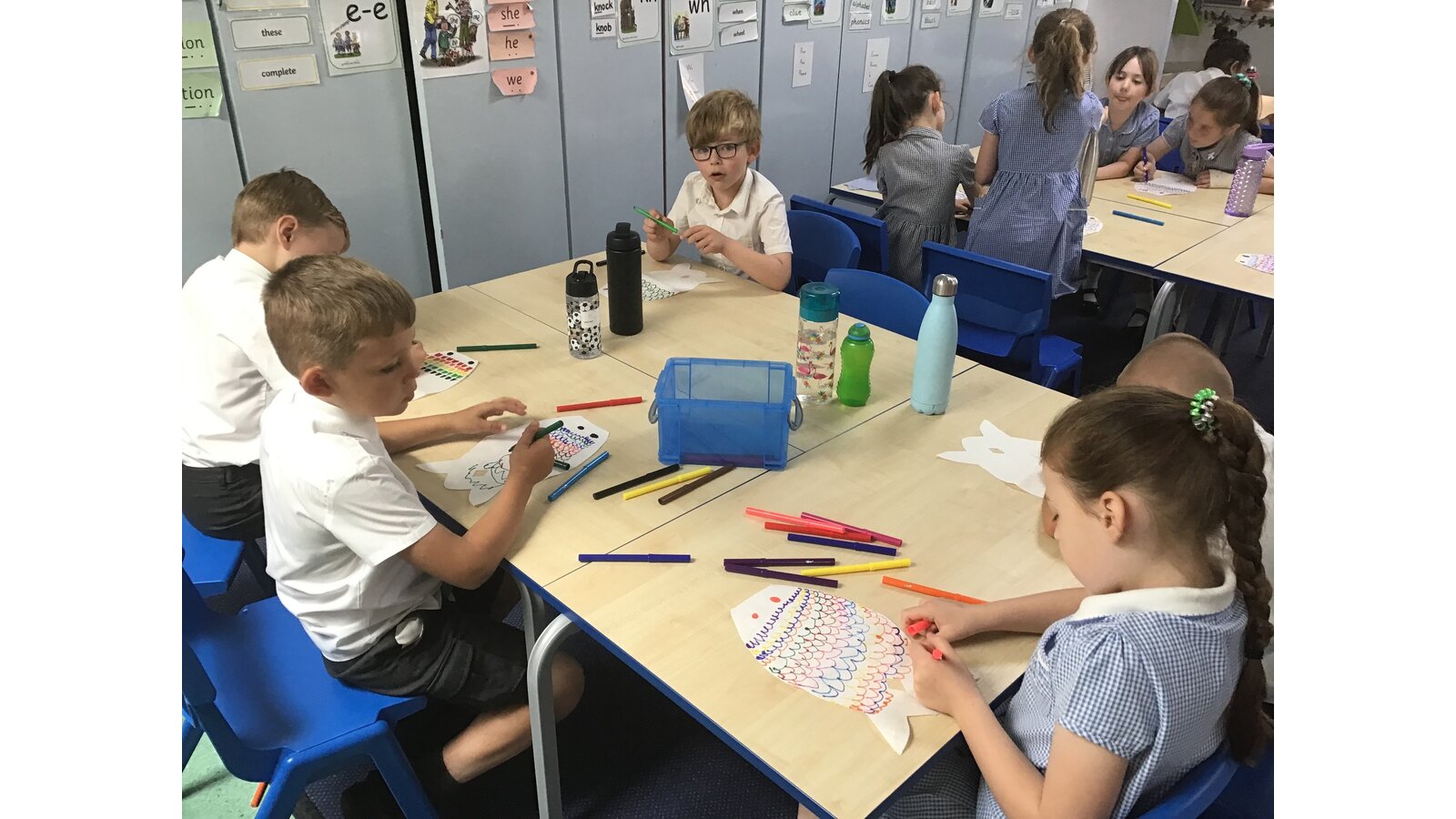 For our Art lesson we made Koinobori kites. We used felt tip pens to draw patterns onto special diffusing paper, we then used water and a paint brush to gently merge the colours together to make the wonderful colours and patterns that you can see. The children then had a little adult help to put the kites together and stick tissue paper on to them. We then went out to fly our kites. It was so much fun!